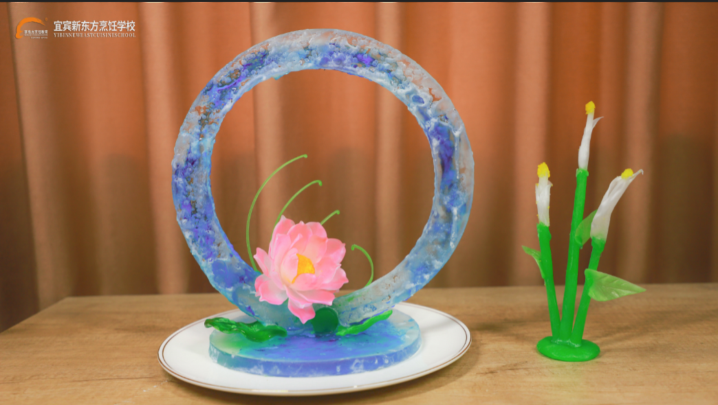 糖艺社团这次以花为主题,紫色的玫瑰在月牙形的糖艺底座上,花朵栩栩如生,花瓣层层分明,仿佛那完全不是糖制作的,而是一块儿完美的紫玉雕刻的玉如意。天蓝与透明的糖做成底座和挺立的圆环,圆环中的小气泡尽显糖艺的工艺技术,那一个个小气泡让整个作品仿佛置于水中,而那一朵惟妙惟肖的荷花,完美的飘在水中,像是长白山的那个天池里开出了一朵荷花,水润、唯美。