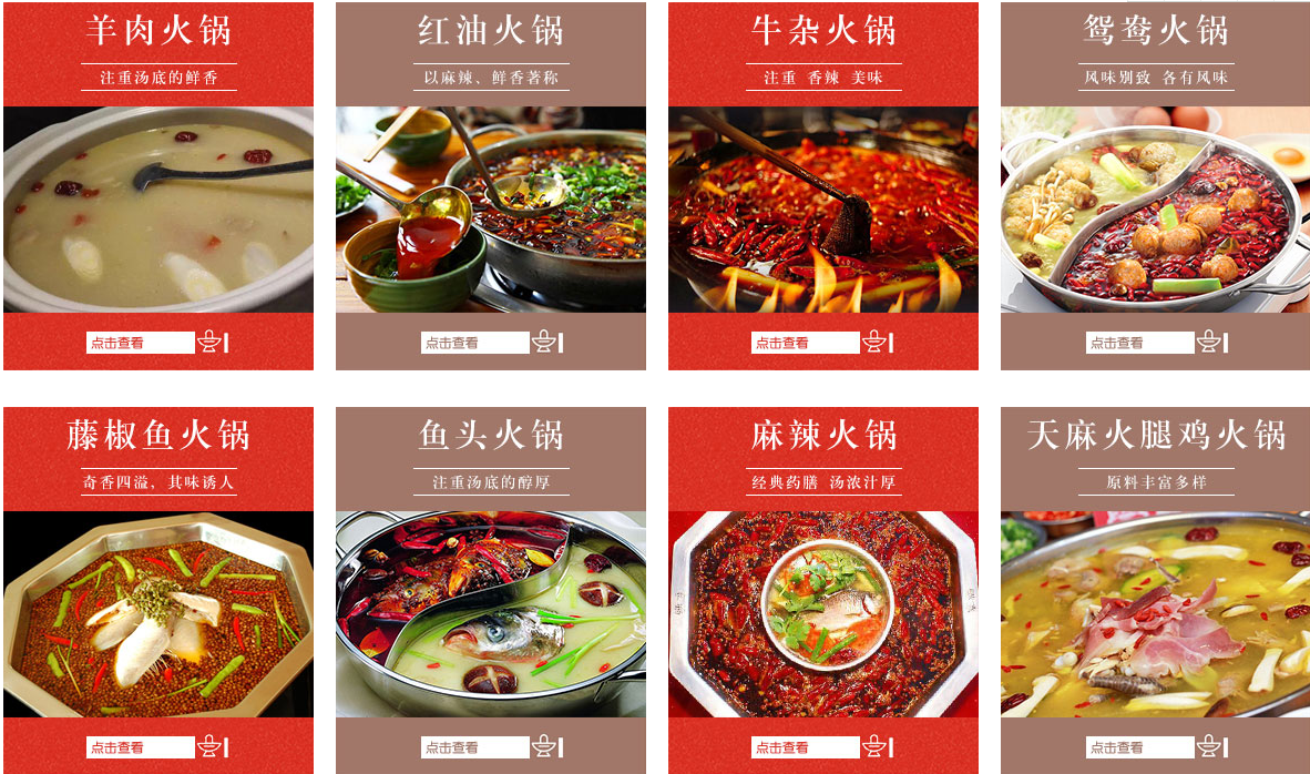 羊肉火锅、红油火锅、牛杂火锅、鸳鸯火锅、藤椒鱼火锅、鱼头火锅、麻辣火锅、天麻火腿鸡火锅,百锅千味,食而不腻,味美无穷。